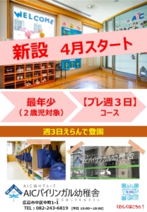 このたび、AICバイリンガル幼稚舎 広島校では、2歳児を対象とした「プレ週3日コース」を新たに開設いたします。